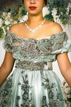 A pretty Blouza typically Oranaise, a dress of a certain elegance that will highlight your figure. The boat collar is handmade with pearls and precious stones, a beautiful matching belt completes the outfit.