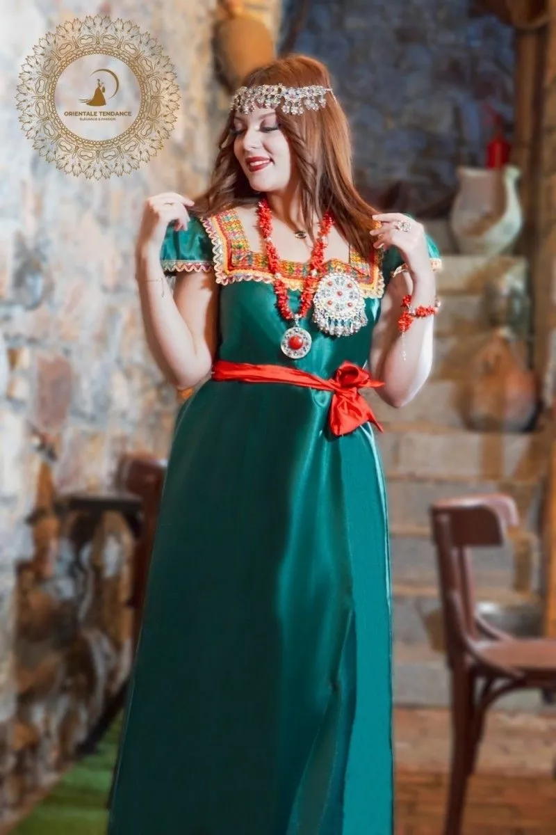 Very beautiful Kabyle dress, simple with a little touch of modernity, it is composed of two-pieces, the main piece a long satin dress with a square neck, accompanied by a belt to complete the outfit.
