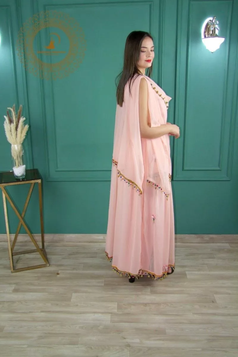 Very nice Chaoui ceremonial outfit, composed of 4 pieces, a pretty long muslin dress, a traditional chaoui top in cotton veil, a long skirt, and a nice veil completes the outfit.