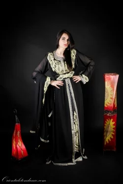 Caftan Hénna; à la fois chic mode et moderne cet ensemble composé d'un caftan brodé et sfifa en haut, une ceinture assortie qui va dessiner à la perfection votre taille et une cape avec capuche en voile et broderies dorées, fera de vous le centre de toutes les attentions.