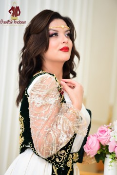 Une Ghlila contemporaine " karakou Algerien Hania "agrémentée de broderies ornées de pierres incrustées.la tenue se compose de quatre pièces un magnifique gilet en velours brodé à la main Le sarouel en forme (Chelka) en satin, une tunique en satin manches en tulle et une ceinture brodée ajustable pour embellir le tout.